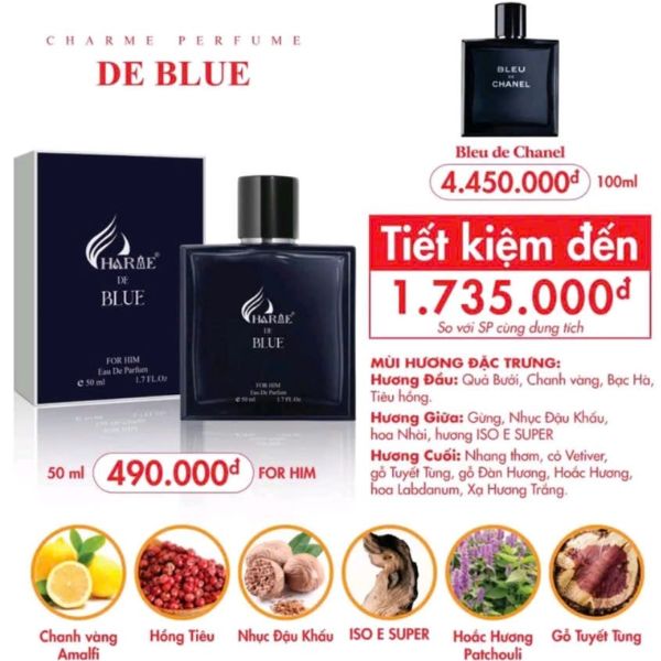 Charme De Blue 50ml được sản xuất giống tông mùi nước hoa Bleu De Chanel.